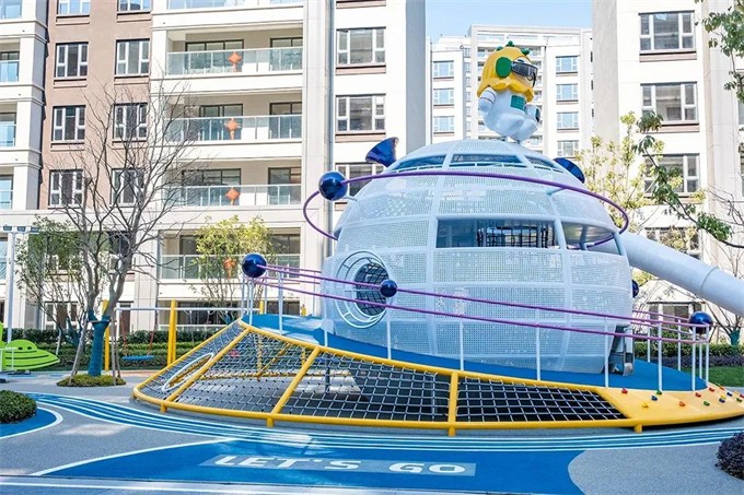 映入眼帘的是我们的主题星球设备,整体轮廓呈现出韵律的星球形态,构成清晰的游戏边界,是值得孩子勇敢探索的地方。