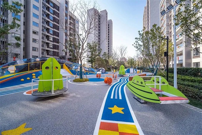 彩虹桥旁边的故事彩绘墙巧妙地将游乐场地与周边建筑分开。拱形的彩虹桥成爬坡状,斜坡的坡度根据造型设置大于45°,同时设置5%的排水坡度。缓冲区侧坡的设计,提供了幼儿锻炼攀爬的空间。