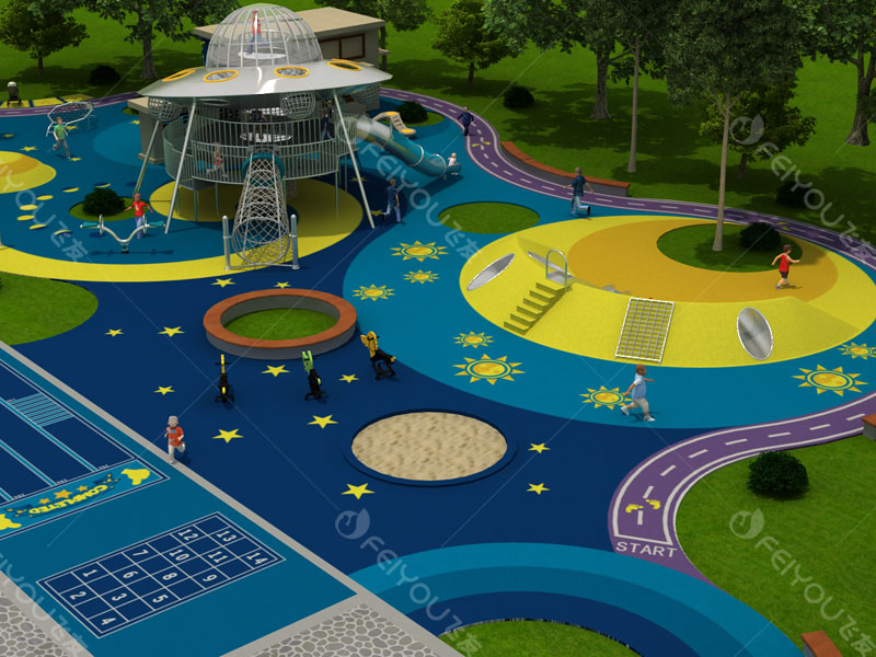 本设计以“UFO”造型钻网为中心,辅以滑滑梯、秋千、蹦床、微地形,培养幼儿钻、爬、滑、晃等能力,为幼儿打造全方位的游戏体验more