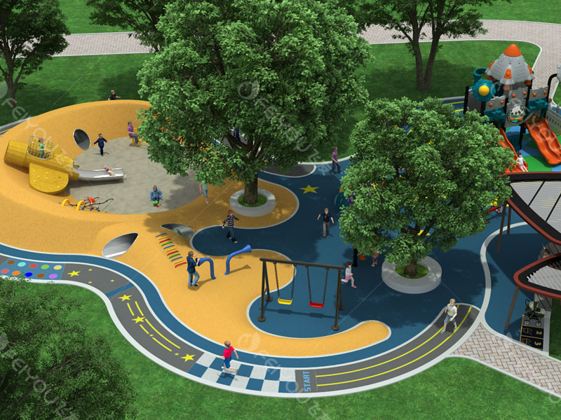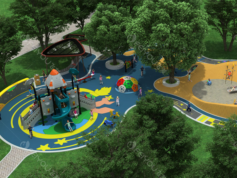 本设计以“丛林发射塔”为中心,整装待发的“航天飞机”造型滑梯、坡度适中的微地形,掩映在密林深处,给人一种神秘、幽深的感觉,向太空出发,是幼儿与生俱来的梦想。项目需求