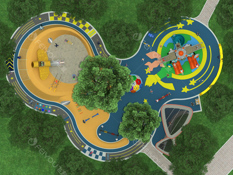 亮丽的地面色彩,让游乐设施在阳光下格外光彩夺目。空中鸟瞰游乐场的全貌。设计理念